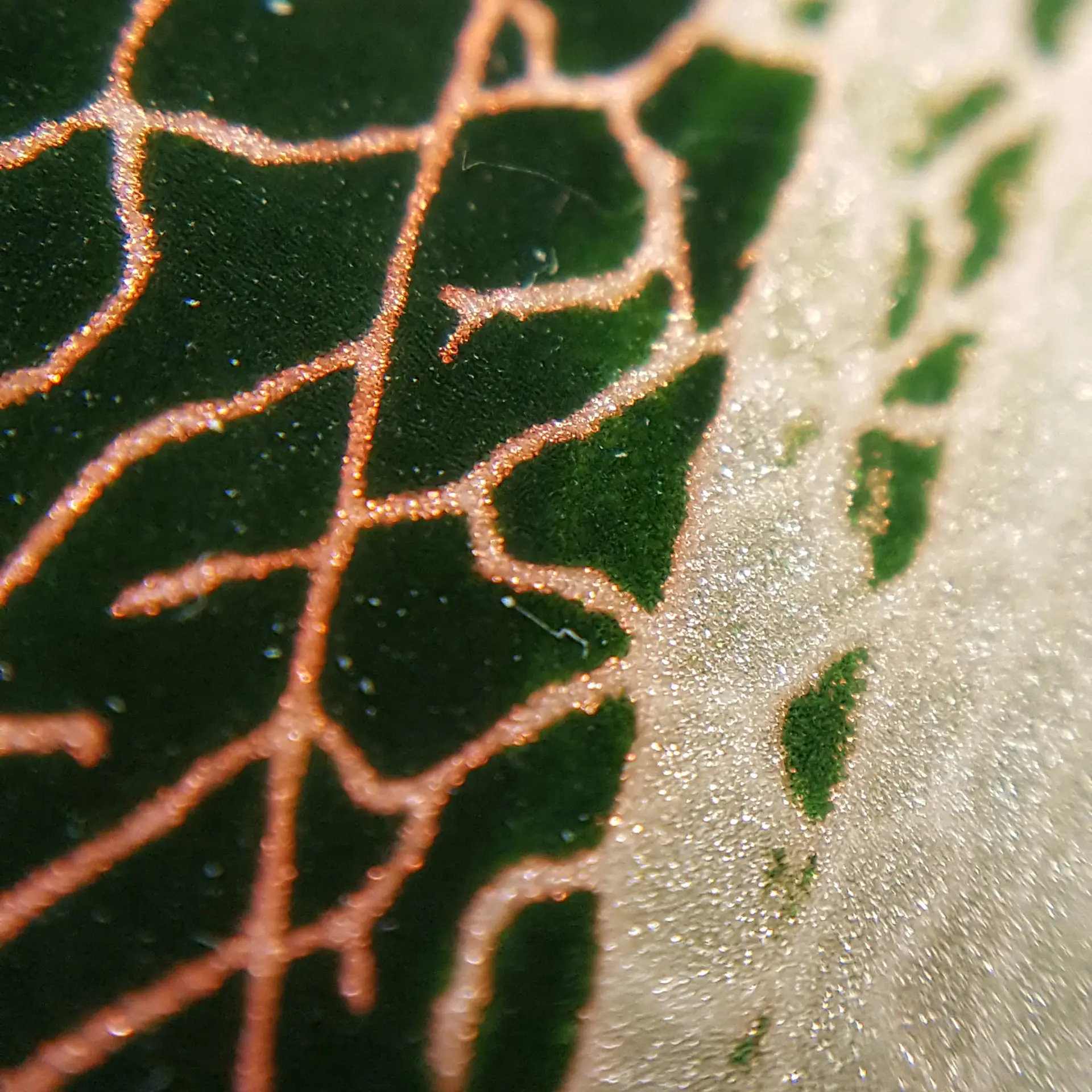 Wahrlich ein eingefangener Traum sind die Blätter der Juwelorchidee Anoectochilus roxburghii 'Dreamcatcher' (Wall.) Lindl. 1832: Eine stark verbreitete zentrale Blattader wird von einem Netz aus goldgelben Äderchen umwoben ... nehmen Sie sich die Zeit und betrachten Sie sich diese Blätter bei einfallendem Sonnenlicht genauer ... Sie werden entzückt sein. Sicherlich eine meiner schönsten Juwelorchideen ist diese südostasiatische Heilpflanze. Sie gedeiht prima im temperierten Bereich und mag keine direkte Sonne. Auch zu feuchtes Substrat schadet ihr, doch sollte das Sphagnum Moos nie ganz trocken fallen. Die gezeigten Bilder sind beispielhaft, die Pflanze die Sie erwerben ähnelt den Abbildungen.